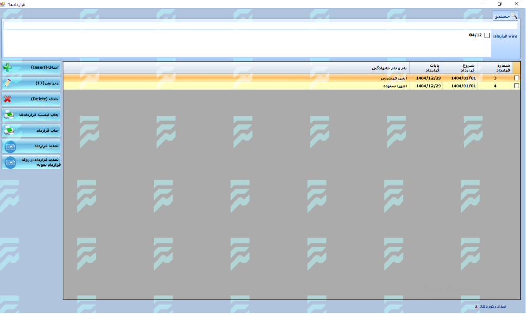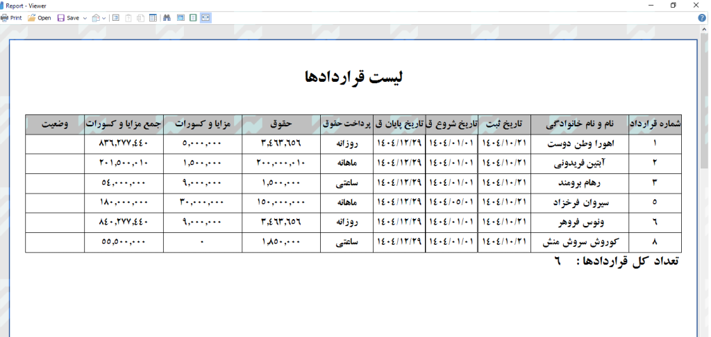 همانطور که مشاهده میشود، لیست قراردادها بهصورت خلاصه و آماده چاپ نمایش داده میشود.