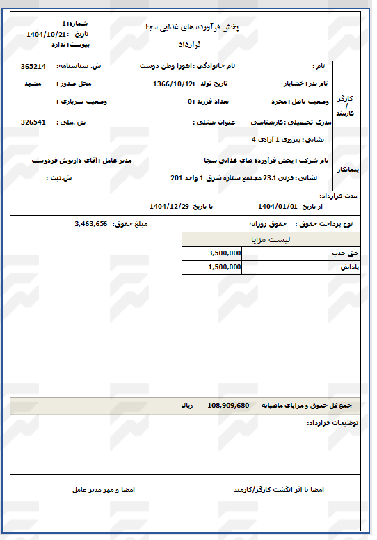 در این مرحله، قرارداد شخص موردنظر بههمراه جزئیات کامل جهت چاپ نمایش داده میشود.