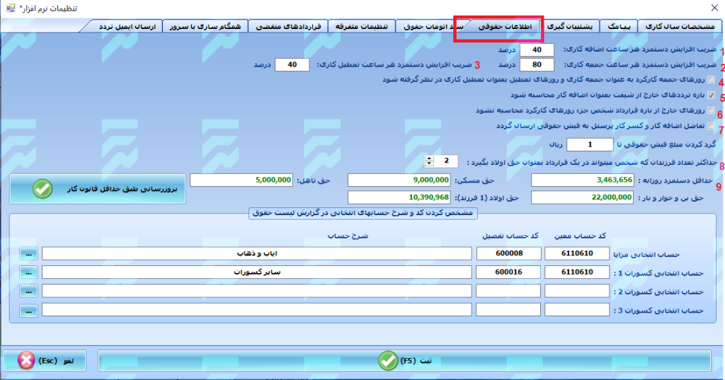 در این بخش میتوانید مواردی مانند ضرایب اضافهکاری، جمعهکاری، تعطیلکاری، تعداد فرزندان مشمول و حداقل دستمزد را تنظیم نمایید.