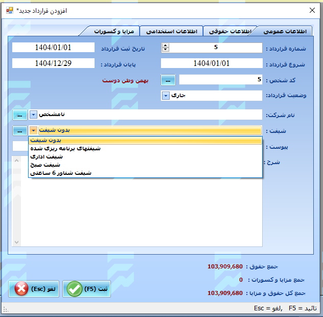 با فعالسازی گزینه «مزایا و کسورات بر اساس قیمتهای جدید بهروزرسانی شود»، قرارداد جدید با مزایا و کسورات بهروز محاسبه میشود.