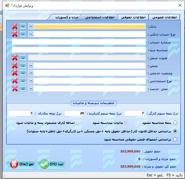 همچنین میتوانید تنظیمات مربوط به بیمه و مالیات فرد را مشخص کنید.