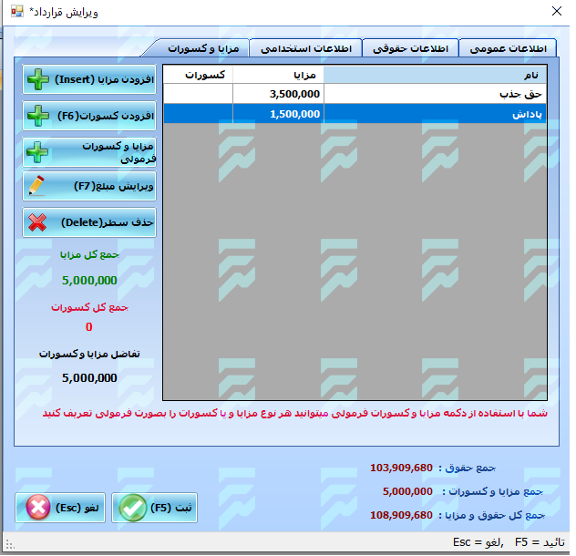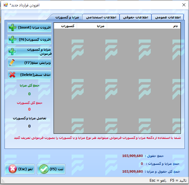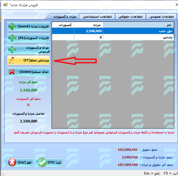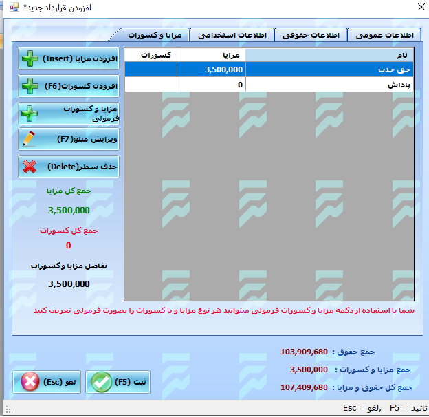 افزودن کسورات دقیقاً مشابه افزودن مزایا است، با این تفاوت که از دکمه «افزودن کسورات» استفاده میشود.