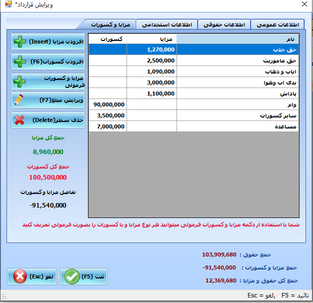 در این نسخه امکان تعریف قرارداد برای هر یک از پرسنل و مشخص نمودن نوع حقوق و دریافتی (حقوق ثابت – روزانه یا ساعتی) و همین طور تعریف مزایا و کسورات حقوق فراهم شده است.
