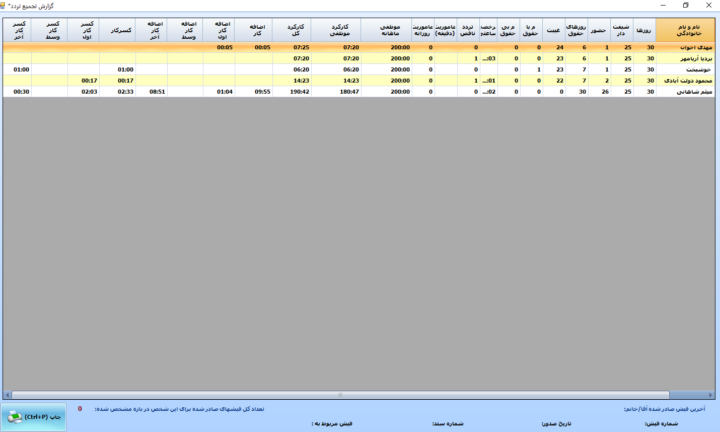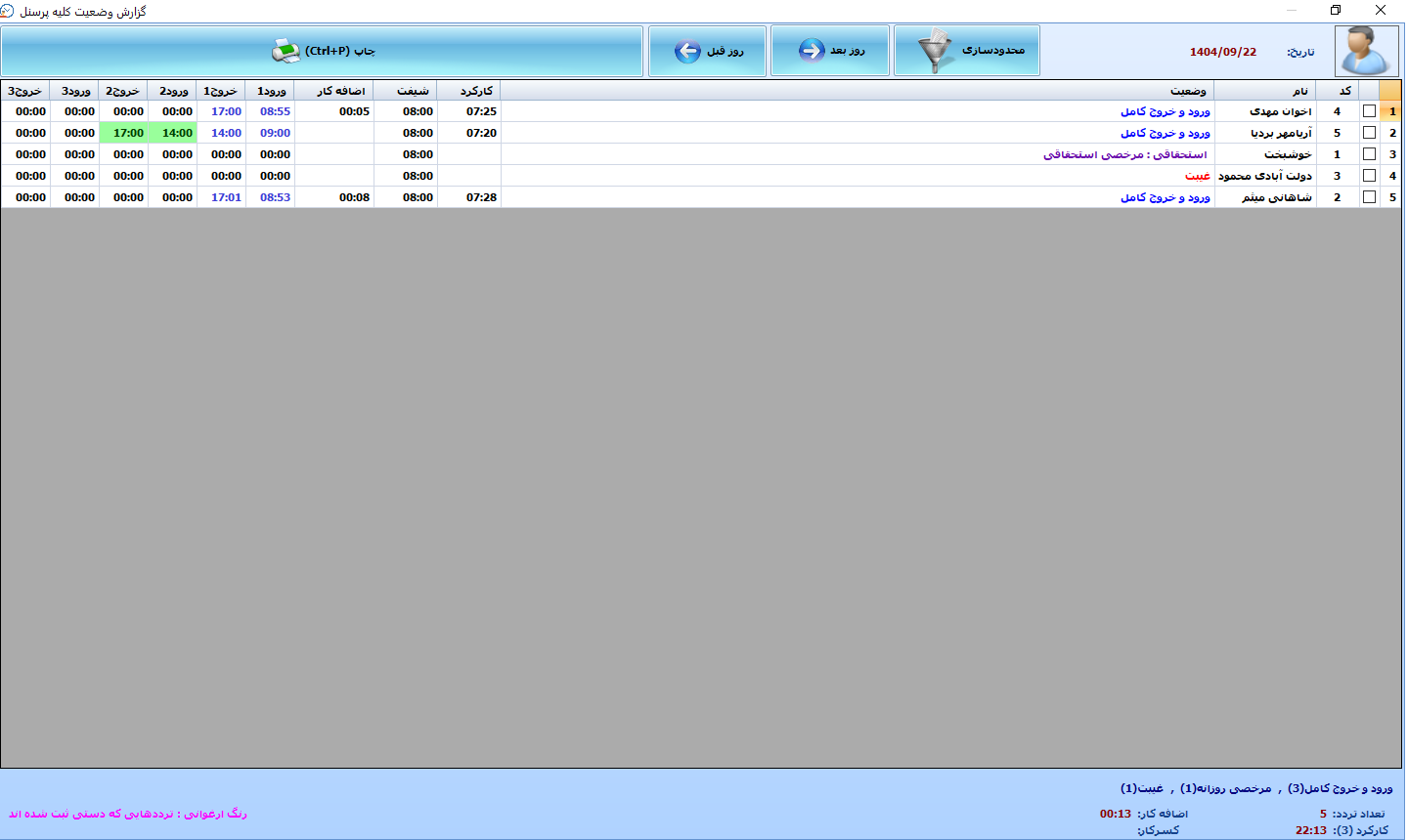 | گزارش جامع تردد پرسنل(تعداد روز های کارکرد،غیبت،مرخصی،کسرکار و...) | دارد |