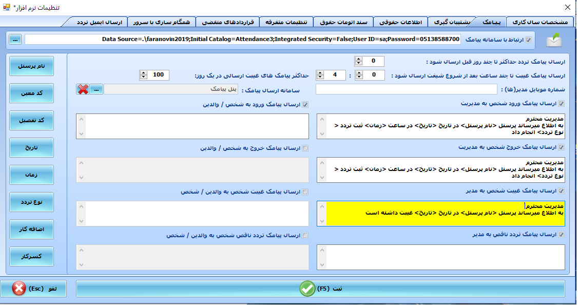 همچنین اگر بخواهید، میتوان پیامک تردد هم ارسال کرد — یعنی هنگام ثبت تردد یا تغییر وضعیت، پیامک به افراد یا مدیران ارسال میشود (بسته به تنظیمات).
